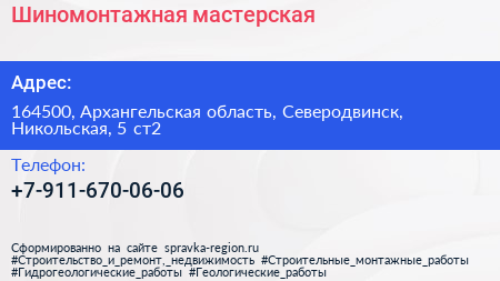 Шиномонтажная мастерская по адресу 164500, Архангельская область, Северодвинск, Никольская, 5 ст2 в дальнейшем Организация, размещена в следующих категориях: