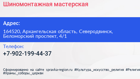 Шиномонтажная мастерская по адресу 164520, Архангельская область, Северодвинск, Беломорский проспект, 4/1 в дальнейшем Организация, размещена в следующих категориях: