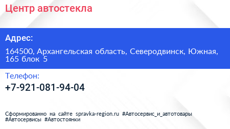 Центр автостекла по адресу 164500, Архангельская область, Северодвинск, Южная, 165 блок 5 в дальнейшем Организация, размещена в следующих категориях: