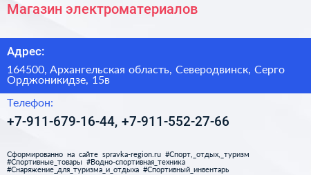 Магазин электроматериалов по адресу 164500, Архангельская область, Северодвинск, Серго Орджоникидзе, 15в в дальнейшем Организация, размещена в следующих категориях: