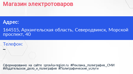 Магазин электротоваров по адресу 164515, Архангельская область, Северодвинск, Морской проспект, 40 в дальнейшем Организация, размещена в следующих категориях:
