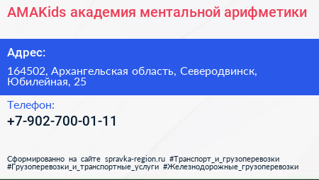 AMAKids, академия ментальной арифметики по адресу 164502, Архангельская область, Северодвинск, Юбилейная, 25 в дальнейшем Организация, размещена в следующих категориях: