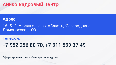Анико, кадровый центр по адресу 164512, Архангельская область, Северодвинск, Ломоносова, 100 в дальнейшем Организация, размещена в следующих категориях: