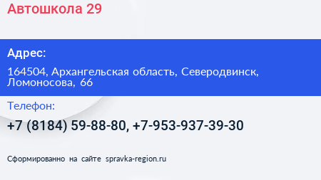 Автошкола 29 по адресу 164504, Архангельская область, Северодвинск, Ломоносова, 66 в дальнейшем Организация, размещена в следующих категориях:
