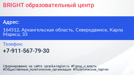 BRIGHT, образовательный центр по адресу 164512, Архангельская область, Северодвинск, Карла Маркса, 33 в дальнейшем Организация, размещена в следующих категориях: