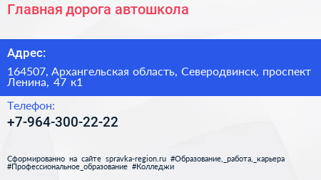 Главная дорога, автошкола по адресу 164507, Архангельская область, Северодвинск, проспект Ленина, 47 к1 в дальнейшем Организация, размещена в следующих категориях: