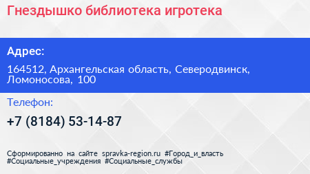 Гнездышко, библиотека-игротека по адресу 164512, Архангельская область, Северодвинск, Ломоносова, 100 в дальнейшем Организация, размещена в следующих категориях: