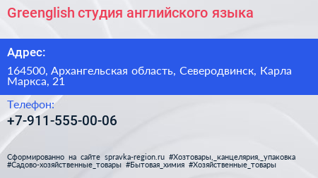 Greenglish, студия английского языка по адресу 164500, Архангельская область, Северодвинск, Карла Маркса, 21 в дальнейшем Организация, размещена в следующих категориях: