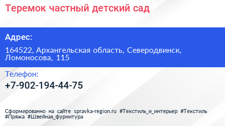 Теремок, частный детский сад по адресу 164522, Архангельская область, Северодвинск, Ломоносова, 115 в дальнейшем Организация, размещена в следующих категориях: