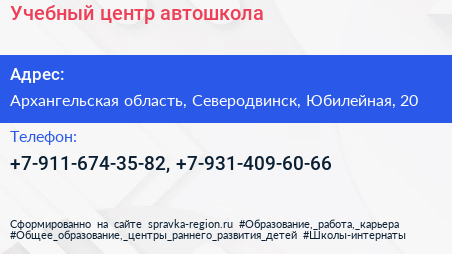Учебный центр, автошкола по адресу Архангельская область, Северодвинск, Юбилейная, 20 в дальнейшем Организация, размещена в следующих категориях: