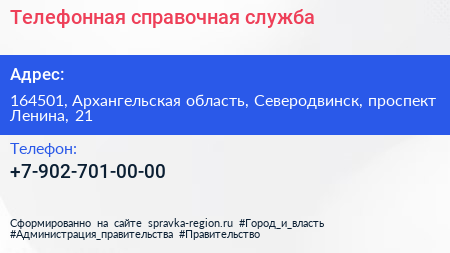 Телефонная справочная служба по адресу 164501, Архангельская область, Северодвинск, проспект Ленина, 21 в дальнейшем Организация, размещена в следующих категориях: