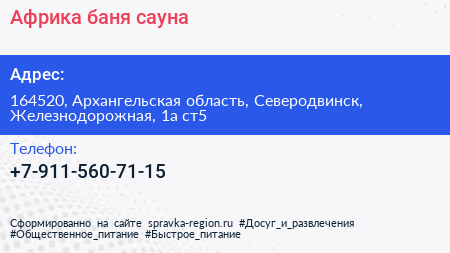 Африка, баня-сауна по адресу 164520, Архангельская область, Северодвинск, Железнодорожная, 1а ст5 в дальнейшем Организация, размещена в следующих категориях: