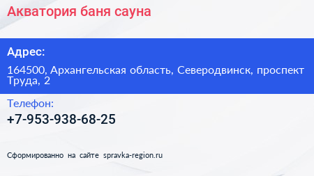 Акватория, баня-сауна по адресу 164500, Архангельская область, Северодвинск, проспект Труда, 2 в дальнейшем Организация, размещена в следующих категориях: