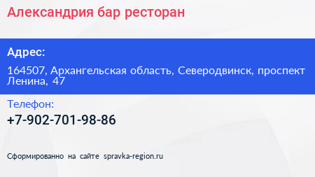 Александрия, бар-ресторан по адресу 164507, Архангельская область, Северодвинск, проспект Ленина, 47 в дальнейшем Организация, размещена в следующих категориях: