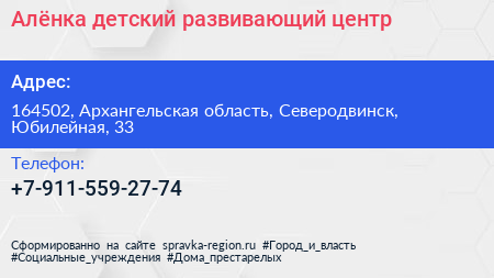 Алёнка, детский развивающий центр по адресу 164502, Архангельская область, Северодвинск, Юбилейная, 33 в дальнейшем Организация, размещена в следующих категориях: