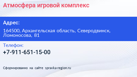 Атмосфера, игровой комплекс по адресу 164500, Архангельская область, Северодвинск, Ломоносова, 81 в дальнейшем Организация, размещена в следующих категориях: