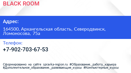 BLACK ROOM по адресу 164500, Архангельская область, Северодвинск, Ломоносова, 75а в дальнейшем Организация, размещена в следующих категориях: