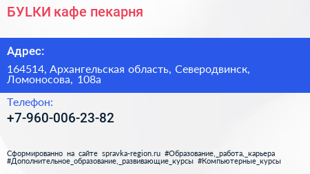 БУLКИ, кафе-пекарня по адресу 164514, Архангельская область, Северодвинск, Ломоносова, 108а в дальнейшем Организация, размещена в следующих категориях: