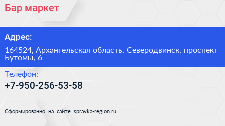 Бар-маркет по адресу 164524, Архангельская область, Северодвинск, проспект Бутомы, 6 в дальнейшем Организация, размещена в следующих категориях: