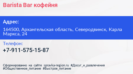 Barista Bar, кофейня по адресу 164500, Архангельская область, Северодвинск, Карла Маркса, 24 в дальнейшем Организация, размещена в следующих категориях: