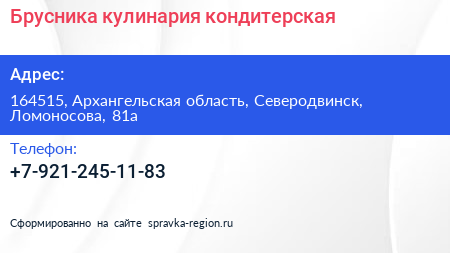 Брусника, кулинария-кондитерская по адресу 164515, Архангельская область, Северодвинск, Ломоносова, 81а в дальнейшем Организация, размещена в следующих категориях: