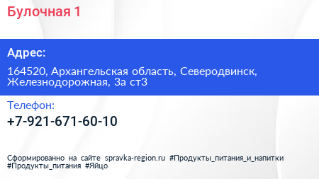 Булочная №1 по адресу 164520, Архангельская область, Северодвинск, Железнодорожная, 3а ст3 в дальнейшем Организация, размещена в следующих категориях:
