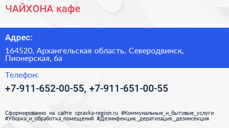 ЧАЙХОНА, кафе по адресу 164520, Архангельская область, Северодвинск, Пионерская, 6а в дальнейшем Организация, размещена в следующих категориях: