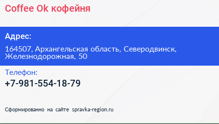 Coffee`Ok, кофейня по адресу 164507, Архангельская область, Северодвинск, Железнодорожная, 50 в дальнейшем Организация, размещена в следующих категориях: