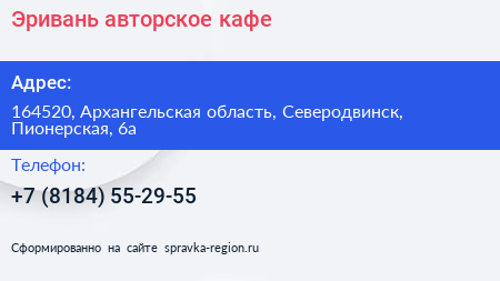 Эривань, авторское кафе по адресу 164520, Архангельская область, Северодвинск, Пионерская, 6а в дальнейшем Организация, размещена в следующих категориях: