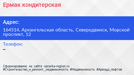 Ермак, кондитерская по адресу 164514, Архангельская область, Северодвинск, Морской проспект, 12 в дальнейшем Организация, размещена в следующих категориях: