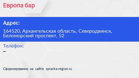 Европа, бар по адресу 164520, Архангельская область, Северодвинск, Беломорский проспект, 52 в дальнейшем Организация, размещена в следующих категориях: