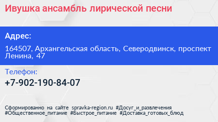 Ивушка, ансамбль лирической песни по адресу 164507, Архангельская область, Северодвинск, проспект Ленина, 47 в дальнейшем Организация, размещена в следующих категориях: