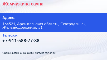 Жемчужина, сауна по адресу 164521, Архангельская область, Северодвинск, Железнодорожная, 51 в дальнейшем Организация, размещена в следующих категориях: