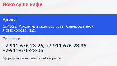 Йоко, суши-кафе по адресу 164522, Архангельская область, Северодвинск, Ломоносова, 120 в дальнейшем Организация, размещена в следующих категориях: