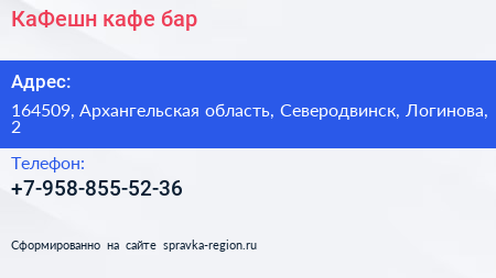 КаФешн, кафе-бар по адресу 164509, Архангельская область, Северодвинск, Логинова, 2 в дальнейшем Организация, размещена в следующих категориях: