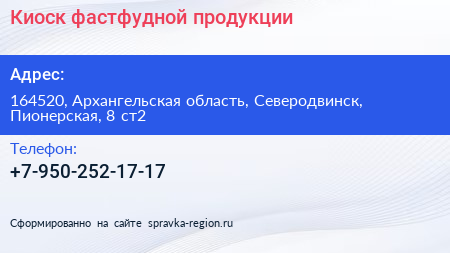 Киоск фастфудной продукции по адресу 164520, Архангельская область, Северодвинск, Пионерская, 8 ст2 в дальнейшем Организация, размещена в следующих категориях: