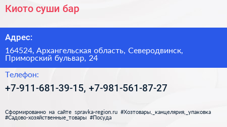 Киото, суши-бар по адресу 164524, Архангельская область, Северодвинск, Приморский бульвар, 24 в дальнейшем Организация, размещена в следующих категориях: