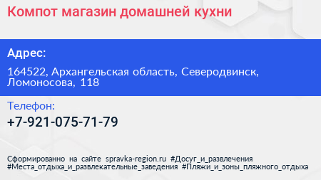Компот, магазин домашней кухни по адресу 164522, Архангельская область, Северодвинск, Ломоносова, 118 в дальнейшем Организация, размещена в следующих категориях: