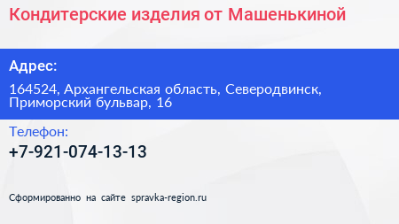 Кондитерские изделия от Машенькиной по адресу 164524, Архангельская область, Северодвинск, Приморский бульвар, 16 в дальнейшем Организация, размещена в следующих категориях: