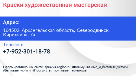Краски, художественная мастерская по адресу 164502, Архангельская область, Северодвинск, Кирилкина, 7а в дальнейшем Организация, размещена в следующих категориях: