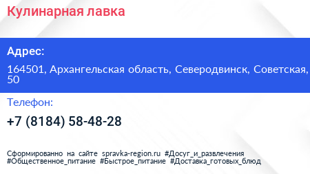 Кулинарная лавка по адресу 164501, Архангельская область, Северодвинск, Советская, 50 в дальнейшем Организация, размещена в следующих категориях: