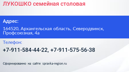 ЛУКОШКО, семейная столовая по адресу 164520, Архангельская область, Северодвинск, Профсоюзная, 4а в дальнейшем Организация, размещена в следующих категориях: