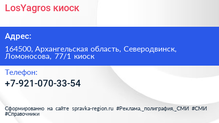 LosYagros, киоск по адресу 164500, Архангельская область, Северодвинск, Ломоносова, 77/1 киоск в дальнейшем Организация, размещена в следующих категориях: