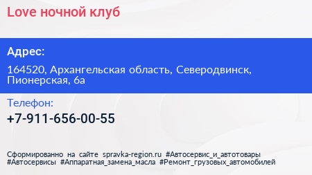 Love, ночной клуб по адресу 164520, Архангельская область, Северодвинск, Пионерская, 6а в дальнейшем Организация, размещена в следующих категориях: