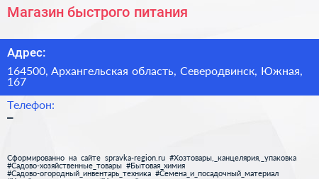 Магазин быстрого питания по адресу 164500, Архангельская область, Северодвинск, Южная, 167 в дальнейшем Организация, размещена в следующих категориях:
