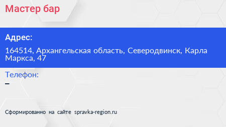 Мастер, бар по адресу 164514, Архангельская область, Северодвинск, Карла Маркса, 47 в дальнейшем Организация, размещена в следующих категориях: