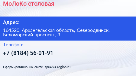 МоЛоКо, столовая по адресу 164520, Архангельская область, Северодвинск, Беломорский проспект, 3 в дальнейшем Организация, размещена в следующих категориях: