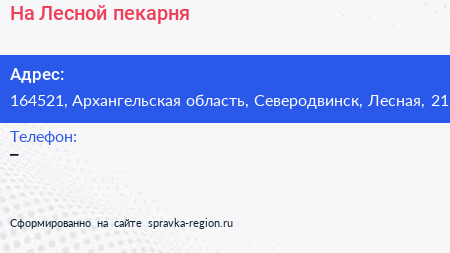 На Лесной, пекарня по адресу 164521, Архангельская область, Северодвинск, Лесная, 21 в дальнейшем Организация, размещена в следующих категориях: