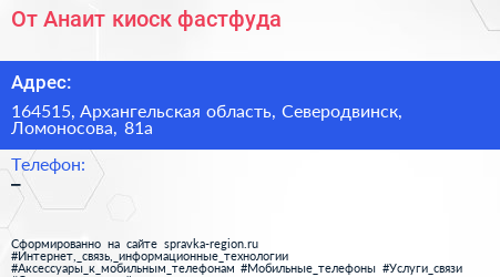 От Анаит, киоск фастфуда по адресу 164515, Архангельская область, Северодвинск, Ломоносова, 81а в дальнейшем Организация, размещена в следующих категориях: