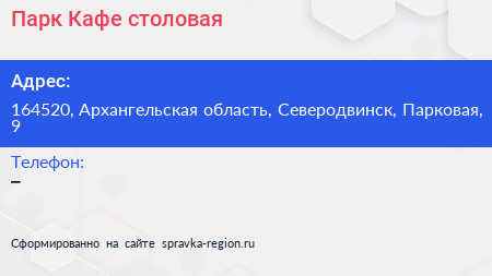 Парк-Кафе, столовая по адресу 164520, Архангельская область, Северодвинск, Парковая, 9 в дальнейшем Организация, размещена в следующих категориях: